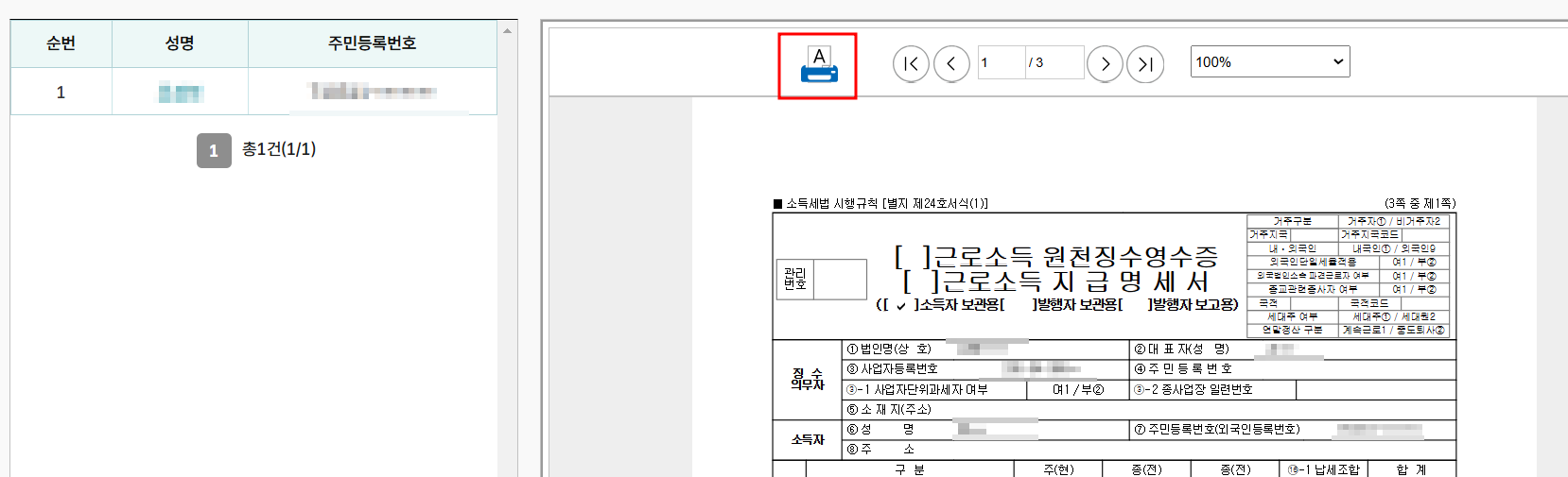 4. 근로자 원천징수영수증 미리보기 나옵니다. 이렇게 홈택스에서 전직장 근로소득원천징수 영수증 발급 받아서 제출하시면 됩니다.